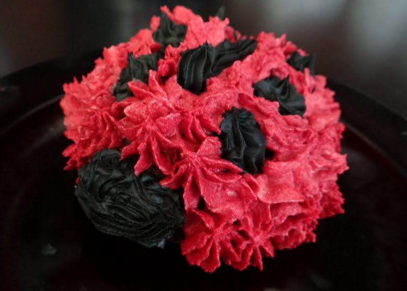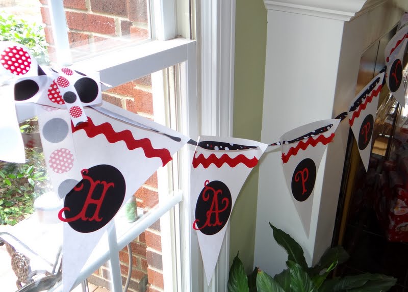 For the girls in attendance, I made feather hair barettes- red and black, of course, instead of party hats.