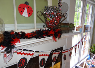 For the girls in attendance, I made feather hair barettes- red and black, of course, instead of party hats.